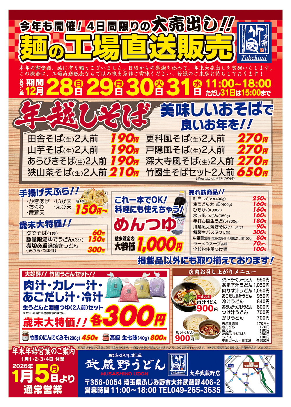 武蔵野うどん竹國 大井武蔵野店にて年末大売出しを実施いたします。